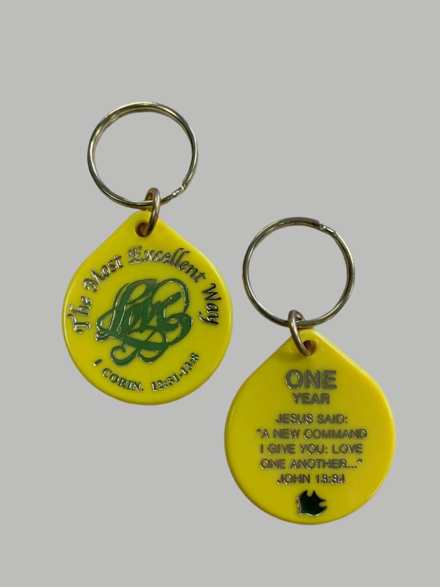 The back has One Year on the top with the verse, Jesus said: "I new command I give you: love one another." John 13:34