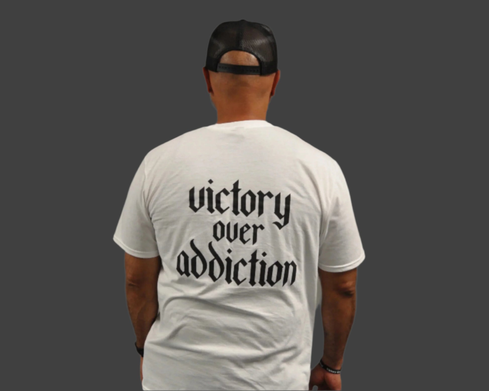 These t-shirts are white and have printing on both front and back. They are a 60/40 cotton and polyester blend.