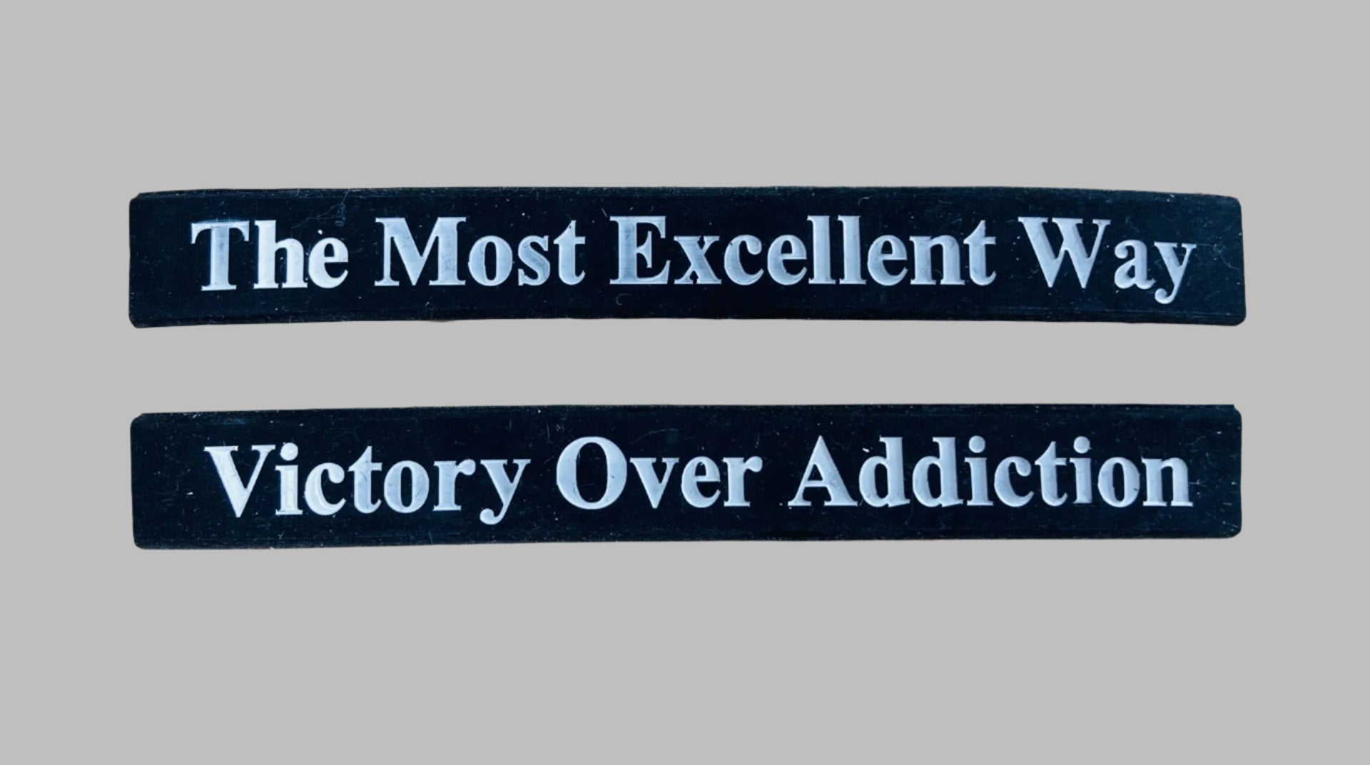 These are solid debossed, color-filled wristbands. The band size is 1/2 inch. The band color is black with a white font color. The front of the band is stamped with The Most Excellent Way. The back is stamped with Victory Over Addiction.